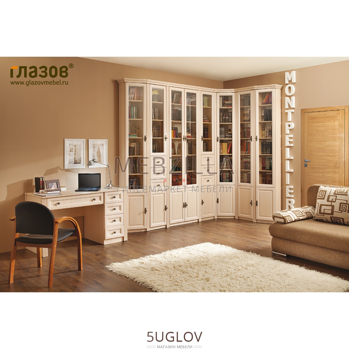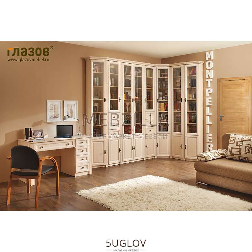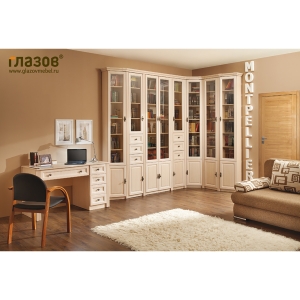 Благодаря модульности Библиотеку Montpellier можно удобно расположить в Вашем домашнем кабинете. Светлый декор не создаёт загруженности комнаты. Шкафы крепятся к стене, а тонированные стёкла защищают книги от прямых солнечных лучей. Петли с доводчиками обеспечат комфорт и тишину при закрывании дверей. Стол письменный выполнен в едином стиле со всей коллекцией и имеет фрезерованную столешницу покрытую прочной текстурной плёнкой ПВХ. Модульная Библиотека Montpellier производит впечатление легкости, надежности и поддерживает позитивный рабочий настрой.