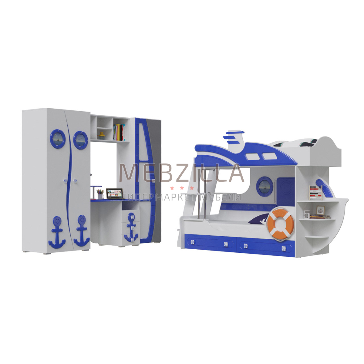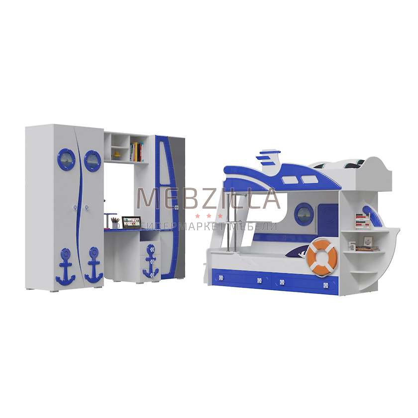В комплектацию 01 набора для детской комнаты Парус входят: кровать двухъярусная Парус Яхта-2, шкаф Парус П-1, стол письменный Парус П-2, полка Парус П-3 и пенал Парус П-4. Удобная и оригинальная двухъярусная детская кровать Парус Яхта-2 выполнена в морском стиле с двумя большими вместительными выдвижными ящиками, которые располагаются под ней и используются для хранения игрушек, белья или других вещей. Кровать похожа на двухпалубную яхту с декоративным спасательным кругом, лестницей с левой стороны и полочками в её правой части. Вместительный шкаф парус П-1 будет дополнительным местом для хранения детских вещей. Внутри шкафа в левой части установлена штанга для навески плечиков, в верхней части предусмотрена полка для головных уборов, а с правой стороны - пять закрывающихся ниш для вещей. Дверцы шкафа украшены декоративными элементами на морскую тематику. Стильности изделию придают оригинальные ручки. Современный письменный стол Парус П-2 для детской комнаты с оригинальным морским декором состоит из рабочей поверхности - столешницы, полки, трёх вместительных выдвижных ящиков и открытой ниши. На столе легко поместятся монитор компьютера или ноутбук, а также материалы для учебы, а на полке, в нише и выдвижных ящиках - документы, книги, учебники, тетради и много канцелярских принадлежностей. Полка Парус П-3 для детской комнаты для удобства выполнена в виде четырёх ниш разного размера. Вместительный пенал Парус П-4 детской модульной комнаты состоит из пяти закрытых ниш для размещения разных вещей ребёнка.