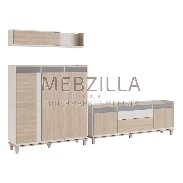 В поисках светлой мебели для гостиной рекомендуем обратить внимание на коллекцию Матера. Тиснение натурального дерева на фасадах прекрасно сочетается с перламутровыми оттенками, в которых выполнен корпус. Опоры из массива окрашены матовой эмалью. Наружная фурнитура отсутствует - дверцы и ящики открываются и закрываются с помощью системы push-to-open. Тумба будет идеальна для телевизора с диагональю до 75 дюймов.