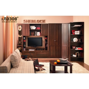 Оригинальная и функциональная Гостиная BERLIN состоит из основных элементов: шкаф многоцелевого назначения состоит из двух секций за глухими дверцами снизу, двух секций с полками сверху, открытых полок и ниши под телевизор, шкаф для белья состоит из четырёх полок, шкаф угловой состоит из ниши с четырьмя полками, широкой полки сверху и штанги для вешалок, шкаф для одежды состоит из верхней полки и штанги для вешалок, шкаф для посуды состоит из четырёх полок, полка угловая состоит из пяти открытых полок, стол журнальный со стеклянной поднимающейся столешницей и полкой под ней. Необычная Гостиная Sherlock выполненная в брутальном английском стиле, создаст строгое и правильное настроение времён конца 19 века.