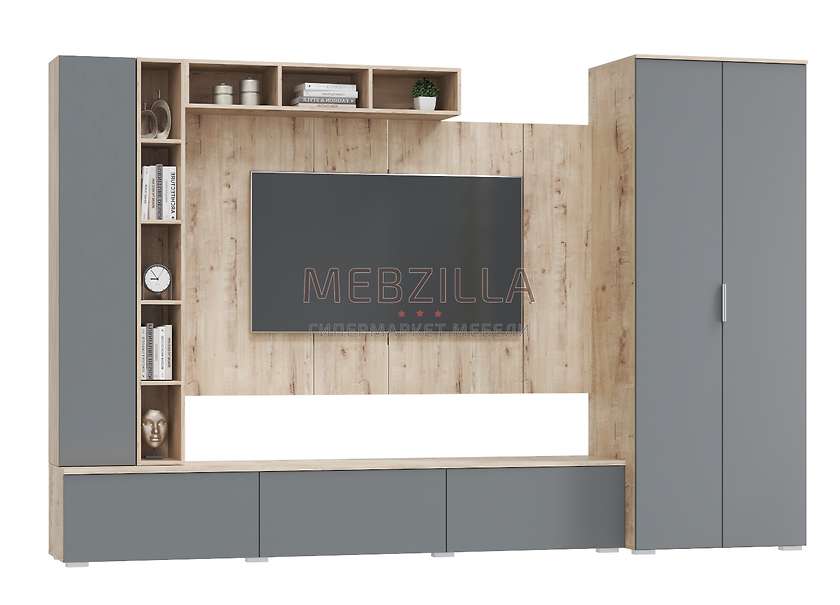 Комплект 5 состоит из двустворчатого шкафа со штангой и двумя полками, напольной ТВ-тумбы, двух открытых полок, навесного шкафа и панно с кронштейном для ТВ.