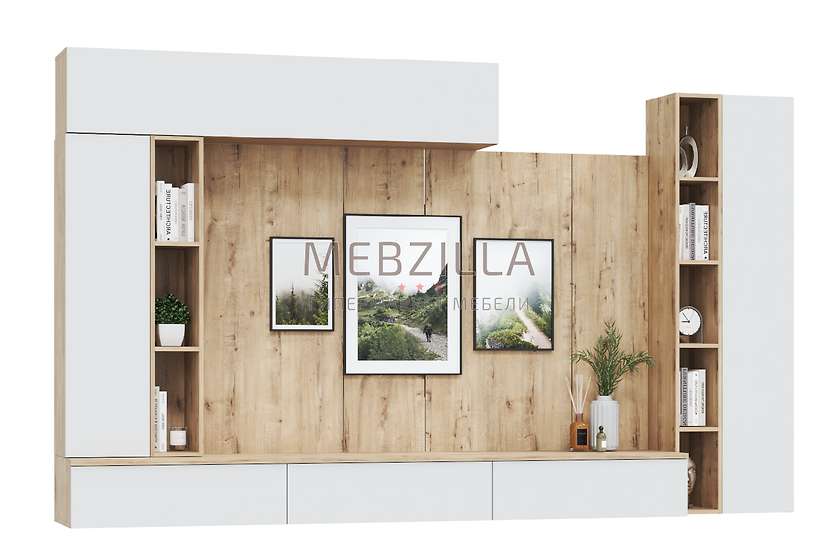 Комплект 6 состоит из трех навесных шкафов, двух открытых полок, навесной тумбы под ТВ и панно.