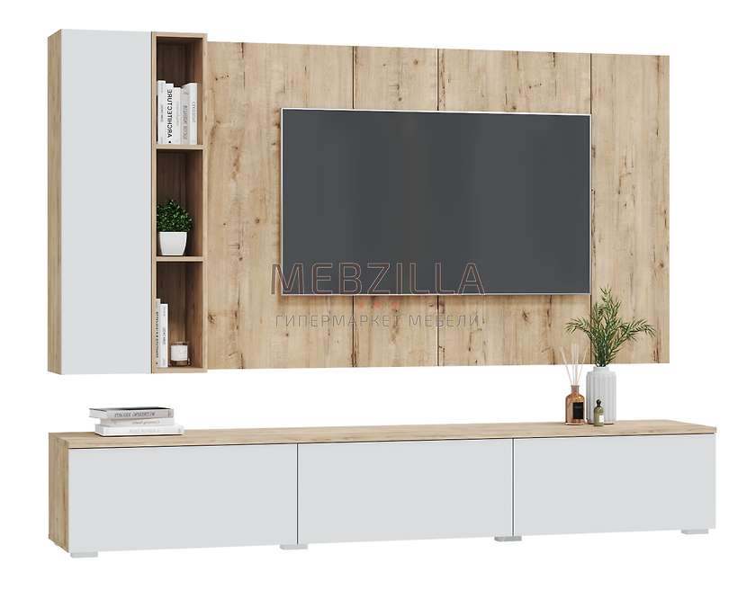 Комплект 8 состоит из напольной ТВ-тумбы, подвесного шкафа, открытой полки и панно.