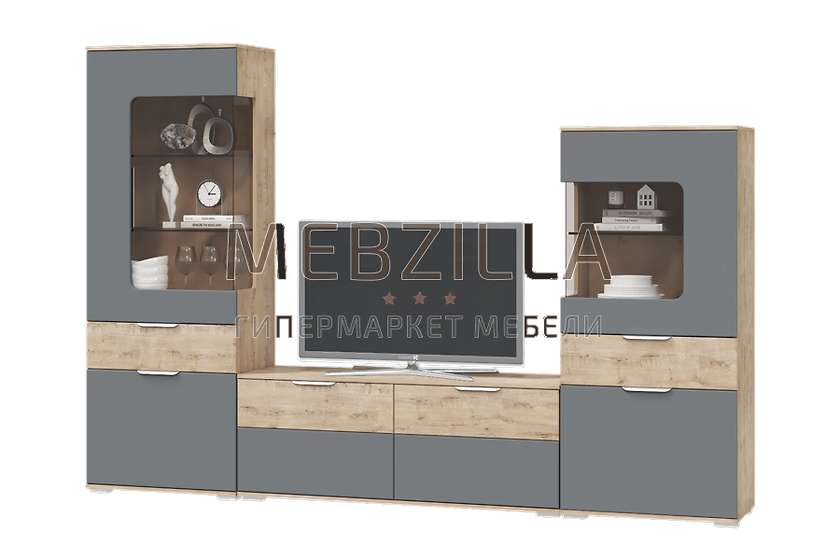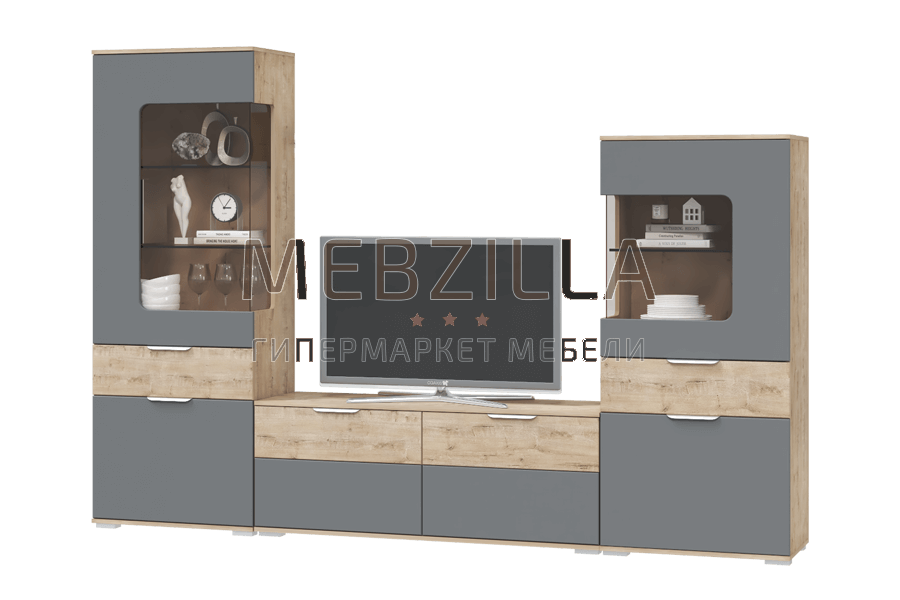Ищите мебель для гостиной в современном стиле? Коллекция Вегас - отличное решение! Стенка состоит из двух функциональных шкафов-витрин и тумбы под телевизор. Сочетание приятного декора с древесной структурой у корпуса и пепельно-серых фасадов создаст непревзойденную атмосферу в гостиной, а комбинированные стеклом дверцы облегчат интерьер. Кроме визуальной привлекательности, мебель достаточно вместительна. Вы с легкостью обустроите ТВ-зону и сможете расположить разноплановые вещи: книги, сервиз, домашнюю утварь и предметы декора.
