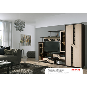 Гостиная Зодиак удивит вас своим изысканным дизайном и функциональностью, а так же станет гармоничным дополнением вашей комнаты. Модель включает в себя стенку с открытыми нишами, закрытыми полками, выдвижными ящиками и нишей под ТВ размером 1100 х 932 х 416 мм. Двухдверный шкаф оснащен двумя широкими закрытыми полками и штангой для хранения одежды на вешалках. Она выполнена из высококачественных материалов, поэтому все элементы компоновки прослужат длительное время.