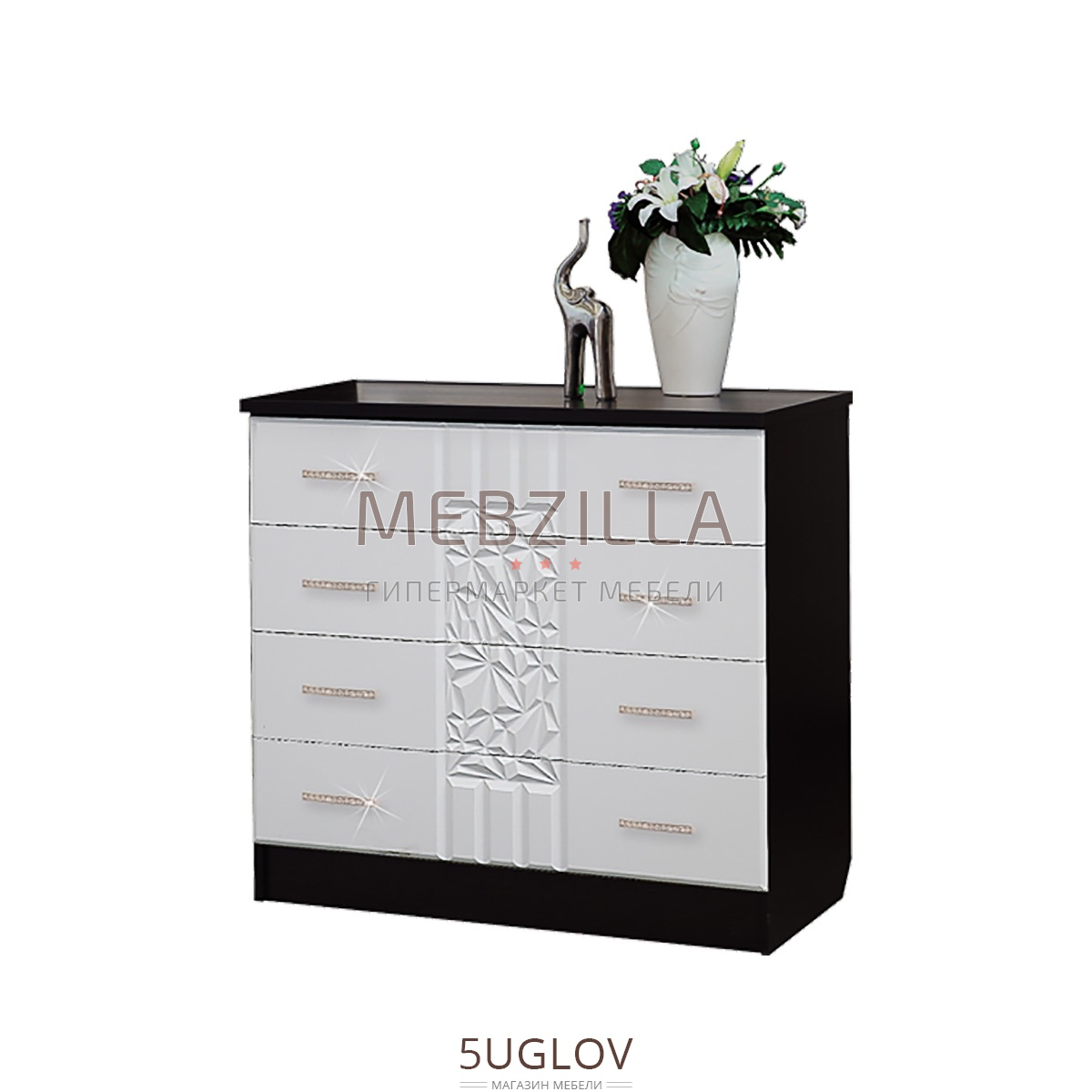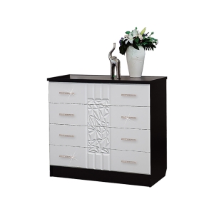 Комод Атлантида выглядит очень стильно за счет контрастного сочетания цветов Венге и Белый Глянец. Дополнительный изыск добавляет резьба на фасаде и металлические ручки. Четыре выдвижных ящика поместят внутрь себя большое количество одежды, а столешница толщиной 22 мм позволит ее использовать как еще одну отрытую полку, на которую можно поставить фотографию родных или цветы.