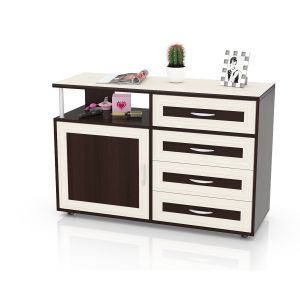 Стильный функциональный комод С-МД-К11 состоит из открытой и закрытой ниш и четырёх выдвижных ящиков с удобными хромированными ручками. Вместительные ящики оснащены металлическими роликовыми направляющими для лёгкости хода. Престижный вид комоду придают резные фрагменты фасада из МДФ и стойка из металла. Практичный комод С-МД-К11 станет отличным дополнением интерьера любой вашей комнаты.