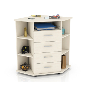Стильный функциональный угловой комод С-МД-К14П состоит из открытой ниши, четырёх выдвижных ящиков с удобными хромированными ручками и двух небольших симметричных боковых отделений, разделённых двумя полками каждое. Вместительные ящики оснащены металлическими роликовыми направляющими для лёгкости хода. Практичный угловой комод С-МД-К14П станет отличным дополнением интерьера любой вашей комнаты.