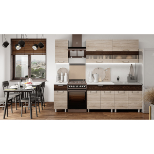 - Кухня продаётся в таком виде, как показано на фото, за исключением стола, стульев и бытовой техники. В её комплект входят корпусы ЛДСП, фасады МДФ, столешницы, ручки модулей. Остальные элементы и оборудование - мойки, вытяжки, фурнитура для навески и т.д. - приобретаются отдельно.