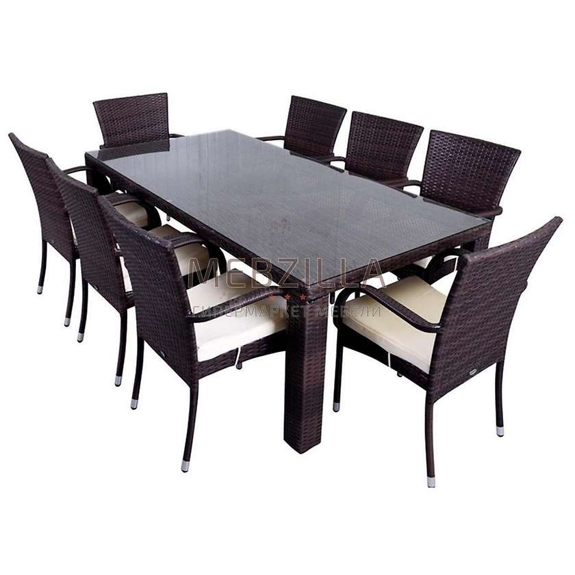 Комплект обеденный Ниламито - удобное и эргономичное место для отдыха либо приема пищи для вашего загородного дома. Плетение кресел выполнено из качественного искусственного ротанга. Комплект включает в себя стол и восемь кресел.