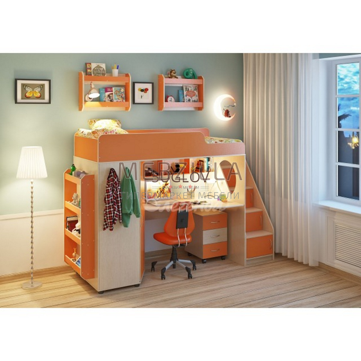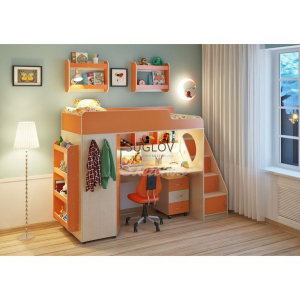 Удобная пятиступенчатая лестница очень устойчива и безопасна. Боковые бортики имеют противоударный кант. Множество полок и удобный шкаф навсегда решит проблему места для игрушек.