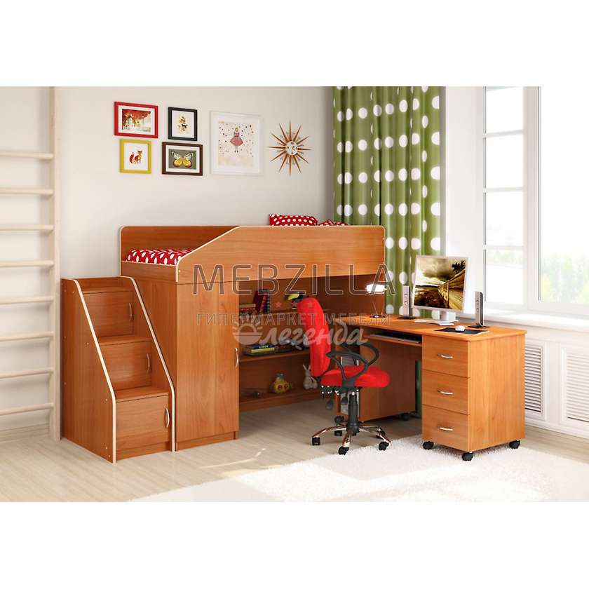 Для учебы или занятий творчеством предусмотрен письменный стол на колесиках с тремя выдвижными ящиками для хранения канцелярии, нишей для системного блока компьютер и выдвижной полочкой для клавиатуры. Для детских игрушек и вещей есть три закрытые ниши за фасадами лестницы и открытый вместительный стеллаж под верхним спальным местом.