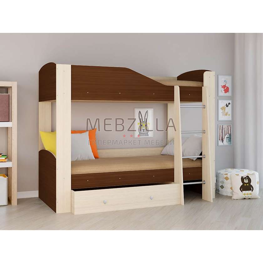 Кровать двухъярусная Астра 2 подойдёт для детей любого возраста, так как имеет два яруса с одинаковыми спальными местами. Они достаточно вместительные, чтобы дети чувствовали себя комфортно. Бортик на втором ярусе высотой 360 мм будет надежной защитой во время сна. Боковинки лестницы глубиной 260 мм выполнены из качественного ЛДСП, а ступеньки из металла прикручиваются с двух сторон несколькими шурупами и держатся надёжно. Под кроватью нижнего яруса расположен вместительный бельевой ящик. Для большей устойчивости и надёжности конструкции спальное место нижнего яруса также укреплёно боковыми панелями. Хороший выбор, особенно для малогабаритных квартир.