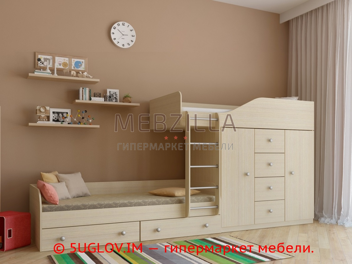 Кровать двухъярусная Астра 6 подойдёт для детей любого возраста, так как имеет два яруса с одинаковыми спальными местами. Они достаточно вместительные, чтобы дети чувствовали себя комфортно. Бортик на втором ярусе высотой 358 мм будет надежной защитой во время сна. Ступеньки лестницы выполнены из металла. Они прикручиваются с двух сторон несколькими шурупами и держатся надёжно. Под кроватью нижнего яруса расположены два вместительных ящика. Так же имеется встроенный шкаф с четырьмя выдвижными ящиками и двумя отделами со штангами для вешалок. Хороший выбор, особенно для малогабаритных квартир.
