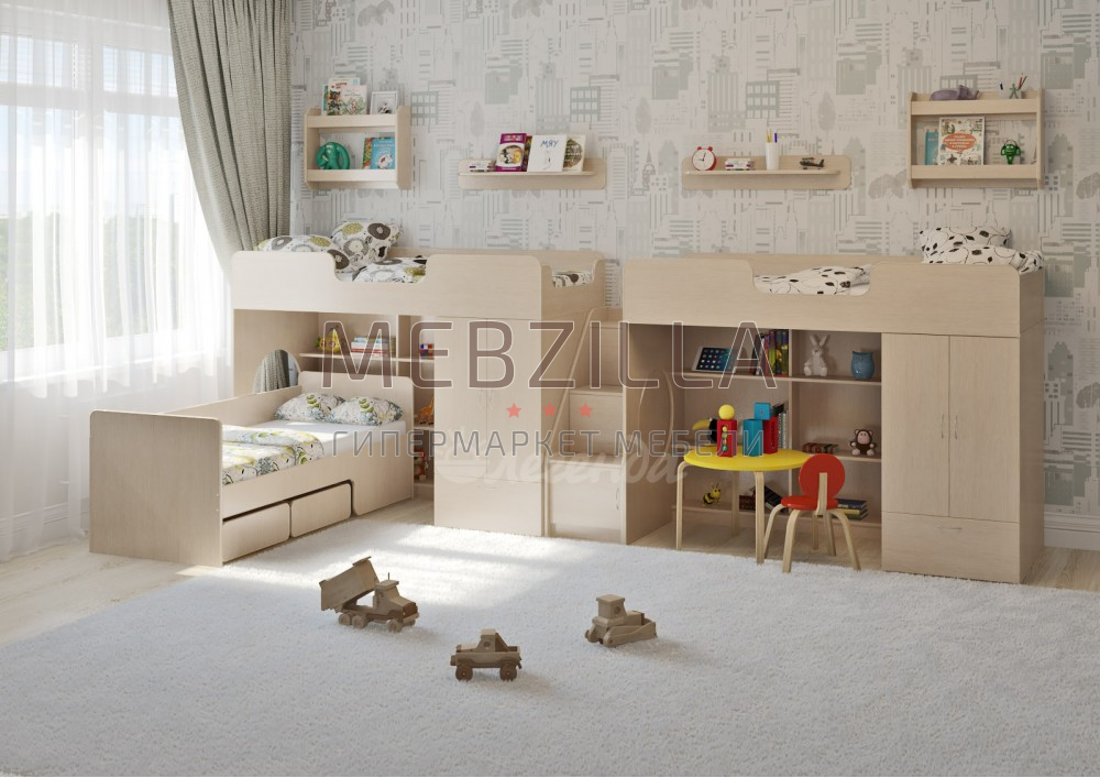 Для хранения детских игрушек, книг, канцелярских и учебных принадлежностей, а также для вещей предусмотрены: четыре открытых полки, три закрытых ниши лестницы с фасадами-дверками, открытые стеллажи под верхними спальными местами, два вместительных выкатных ящика под нижней кроватью и встроенные шкафы с полками и выкатным ящиком.