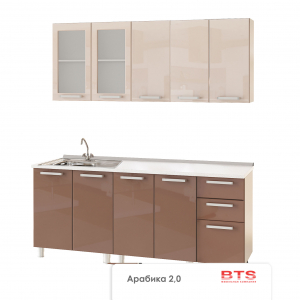 Функциональный кухонный гарнитур Арабика 2.0 Люкс вариант 6 создан специально для небольшой квартиры или дачи. Модель оснащена разными закрытыми полками, нишами, выдвижными ящиками - это поможет вам удобно разместить все кухонные принадлежности. Все модули изготовлены из качественных, экологически чистых и натуральных материалов, поэтому прослужат Вам длительное время.