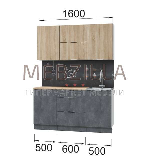 - фасад: МДФ + пленка ПВХ: шкафы настенные - 'Дуб сонома', шкаф-столы кухонные - 'Бетон темный'