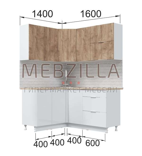 - фасад: МДФ + пленка ПВХ: шкафы настенные - 'Лиственница охотская', шкаф-столы кухонные - 'Белый глянец'