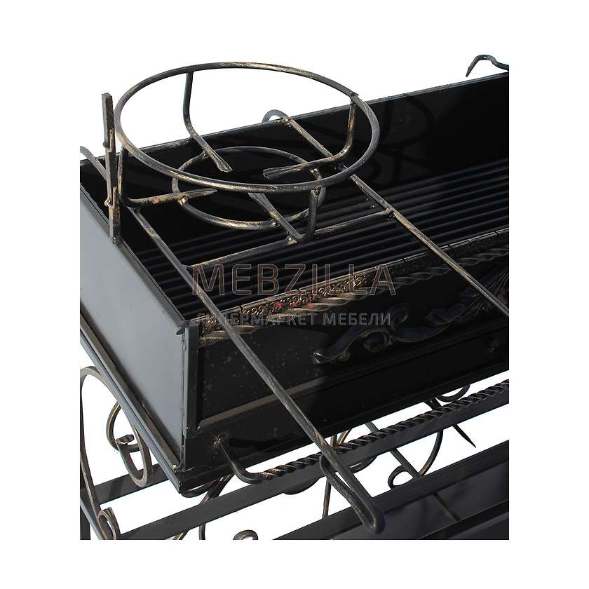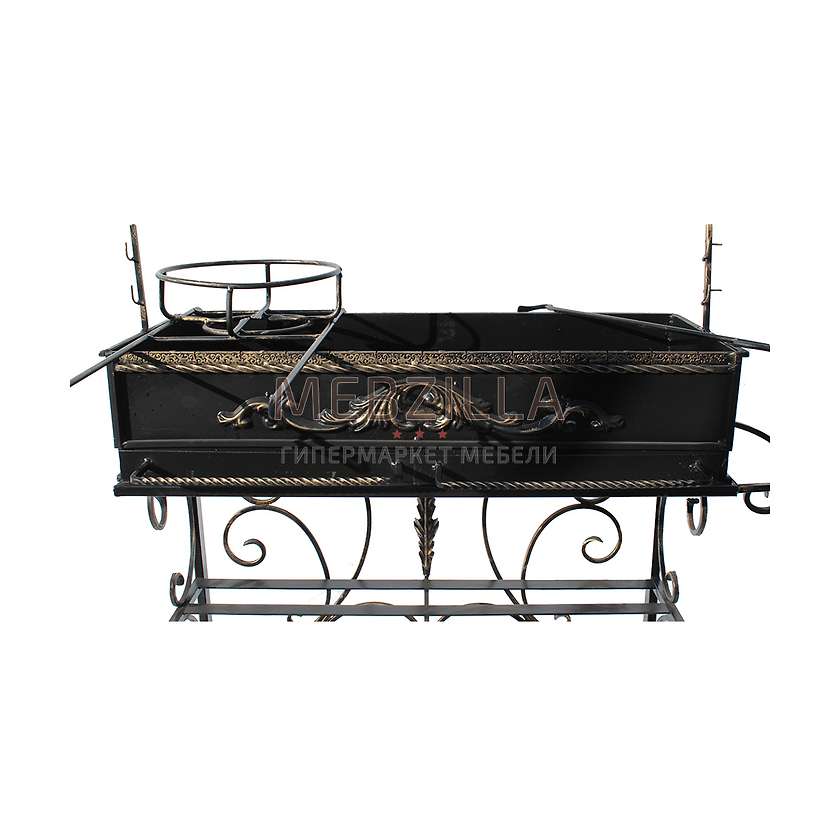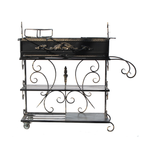 Мангал Сундук станет высококачественным, функциональным и декоративным элементом летней кухни, настоящим уголком отдыха на территории Вашего загородного дома. Устойчивость и надежность конструкции не вызывает сомнений, каждая деталь выполнена отчетливо, все узлы связаны жестко, придавая уверенности всему изделию. Корпус покрытый стойкой к атмосферным влияниям матовой эмалью обеспечит модель долгим эксплуатационным сроком, а декоративная позолоченная патина будет радовать своей привлекательностью при каждом следующем использовании.