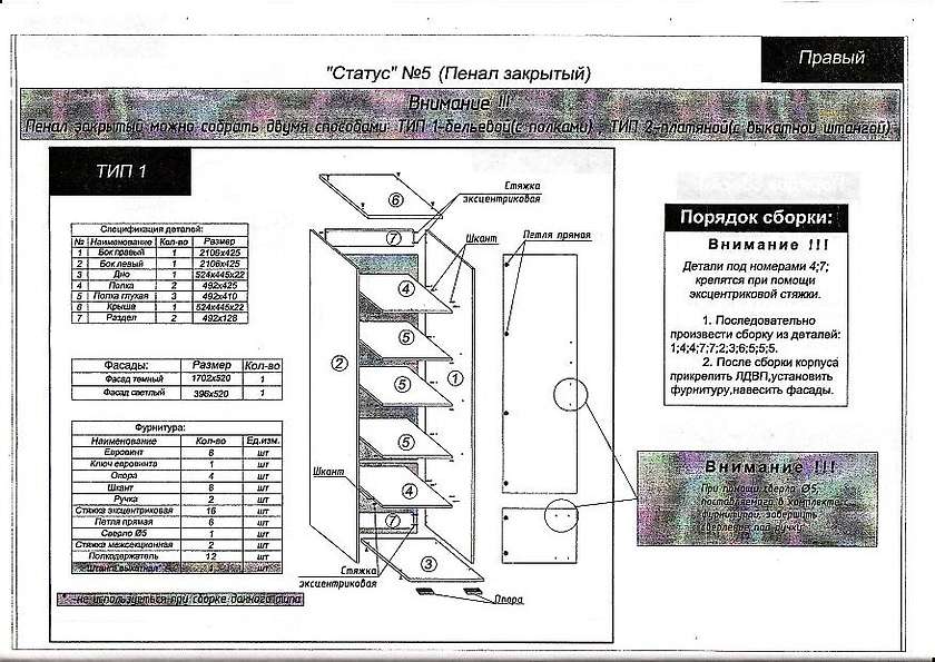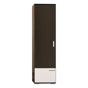 Пенал закрытый №5 из состава модульной системы Статус имеет компактные размеры, но от этого нисколько не страдает его функциональность - в верхнем закрытом шкафчике может размещаться либо четыре полки, либо одна полка и выдвижная штанга для хранения одежды на вешалках-плечиках в зависимости от комплектации. В нижней части пенала расположен второй закрытый шкафчик. Крышка и дно пенала изготовлены из ЛДСП толщиной 22 мм, ручки дверец - металлические. Конструкция пенала универсальна - его можно собрать на левую и на правую стороны.
