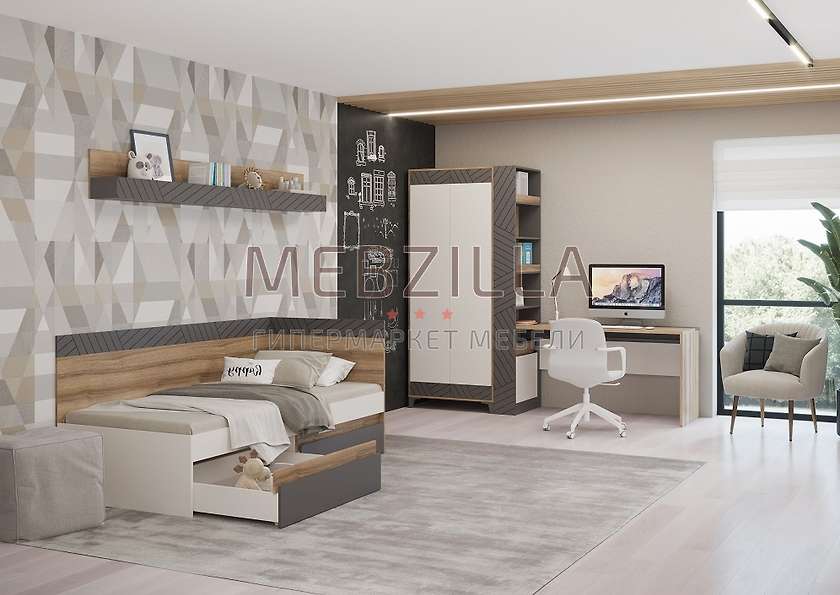 Коллекция мебели для подростковой комнаты Гринвич - универсальное решение для организации пространства, выполненное в современном стиле. Мебель исполнена в модном цветовом сочетании и декорирована геометрическим рисунком. Универсальная сборка - визитная карточка коллекции, которая позволяет грамотно и рационально использовать площадь помещения.
