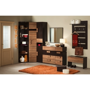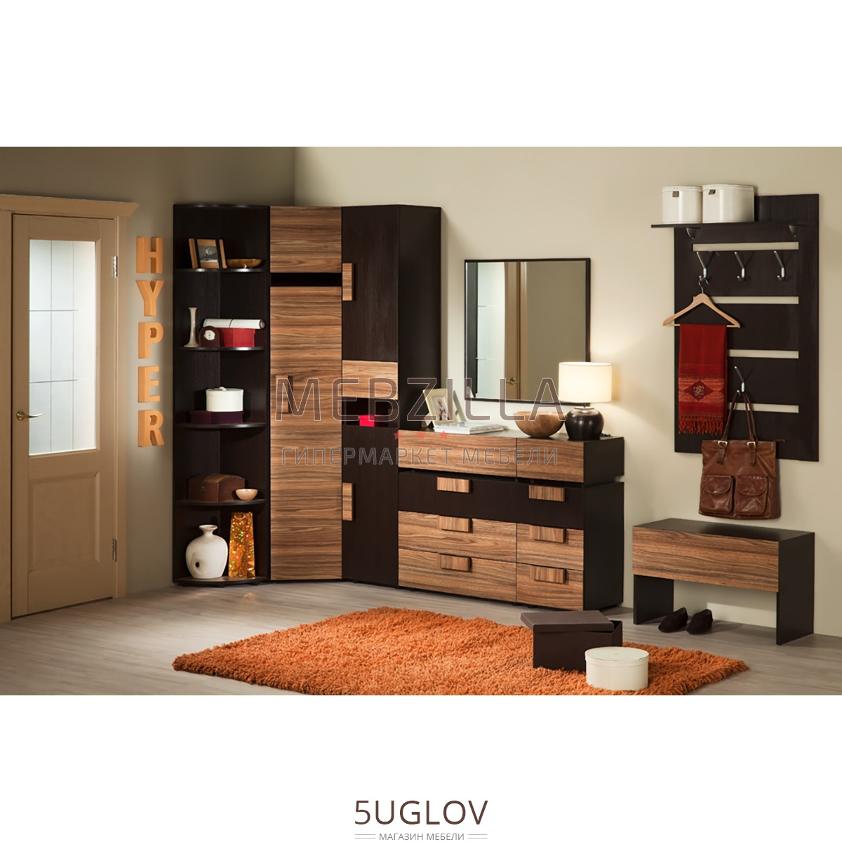 Стильная и функциональная угловая прихожая Hyper имеет все основные необходимые элементы: открытая вешалка с полочкой для головных уборов, шкафы со штангой для вешалок и с полочками для белья, две тумбы, одна из которых выполняет функцию банкетки, комод, угловую полочку и, конечно же, зеркало. Простая и функциональная прихожая Hyper создана для активных и динамичных людей.