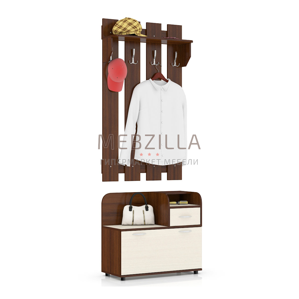 Компактная и практичная прихожая П5 в комплектации 01 состоит из тумбы П5 800 и вешалки П5 800. Тумба для обуви П5 800 состоит из двух закрытых ниш, спрятанных за откидной дверкой, выдвижного ящика и небольшой открытой ниши для мелочей над ним. Вешалка П5 800 оборудована четырьмя удобными крючками для одежды и полкой для головных уборов. Комплектация собрана из элементов набора мебели для прихожей П5.