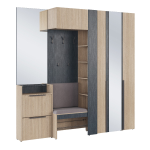 Мебель из коллекции Палермо - это модульный вариант обустройства Вашей прихожей в современном стиле. Выполнена из высококлассного ЛДСП и представлена сочетанием контрастных декоров с текстурой натурального дерева - палермо и рейн мореон. Разнообразие и безусловная функциональность модулей позволят Вам организовать грамотное хранение верхней одежды, уличной и домашней обуви и сезонных аксессуаров даже в малогабаритной прихожей. Комплект 3 состоит из комбинированной вешалки, трехстворчатого шкафа, тумбы для обуви с откидными ящиками и навесного зеркала.