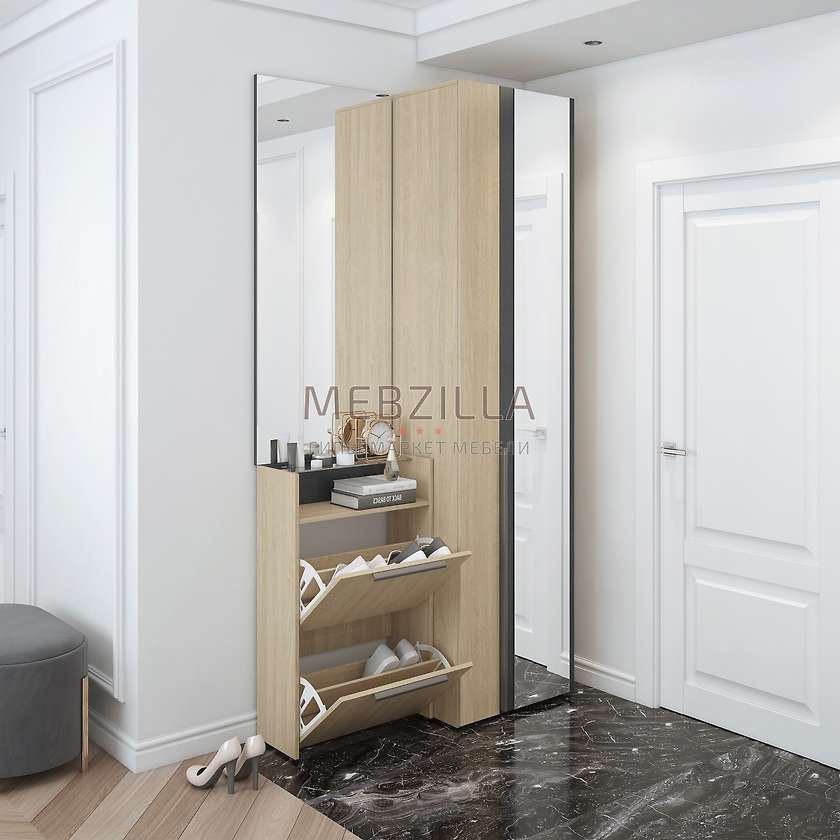 Мебель из коллекции Палермо - это модульный вариант обустройства Вашей прихожей в современном стиле. Выполнена из высококлассного ЛДСП и представлена сочетанием контрастных декоров с текстурой натурального дерева - палермо и рейн мореон. Разнообразие и безусловная функциональность модулей позволят Вам организовать грамотное хранение верхней одежды, уличной и домашней обуви и сезонных аксессуаров даже в малогабаритной прихожей. Комплект 6 состоит из двустворчатого шкафа, тумбы для обуви с откидными ящиками и навесного зеркала.