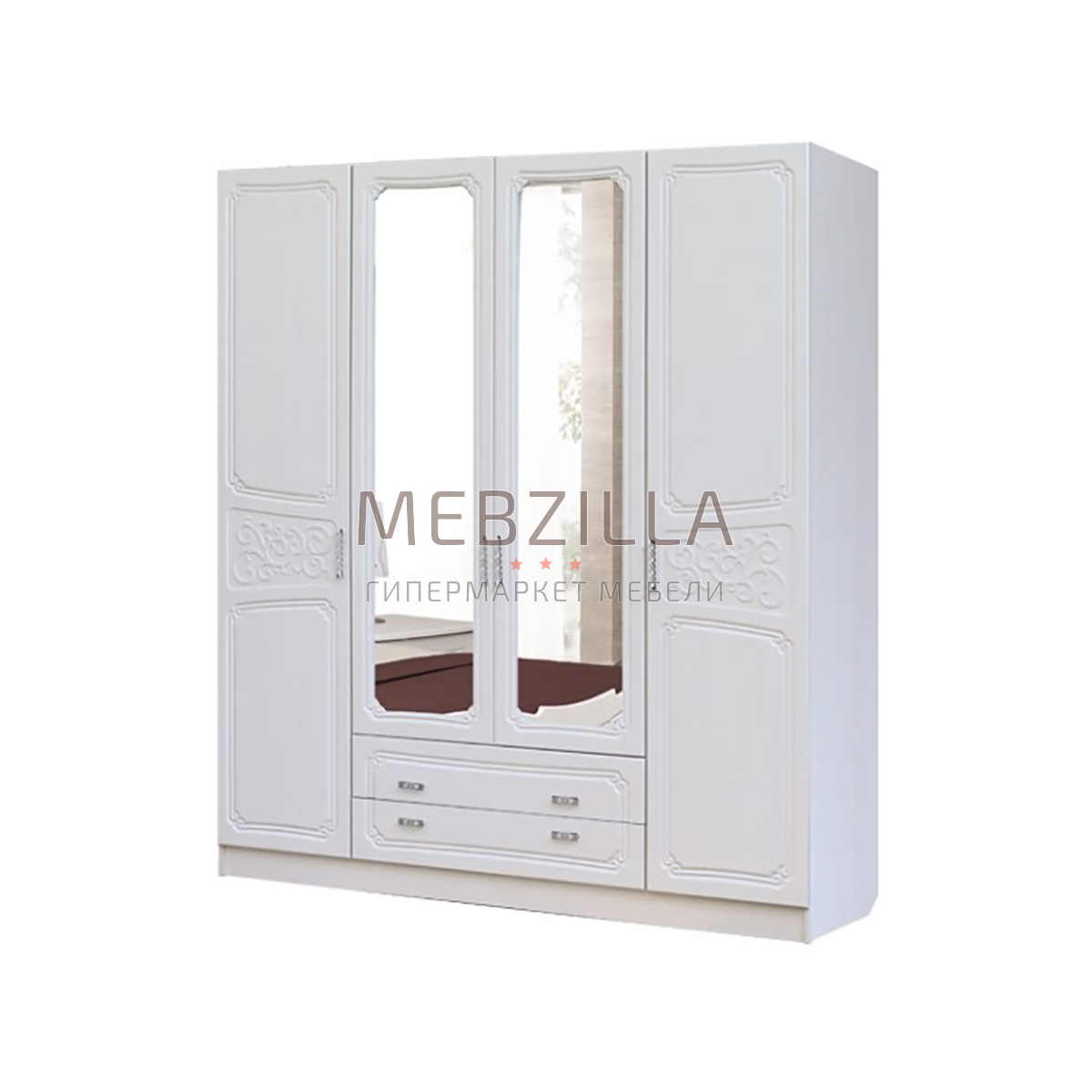 Классический четырехдверный шкаф Тифани из состава модульной спальни возьмет на себя задачи по хранению ваших вещей - для этого в нем есть два больших бельевых отделения, одно платяное с штангой для одежды на вешалках и два больших зеркала с защитной пленкой. Все это комбинируется с фасадом из МДФ с стильным объемным рисунком, выполненном по технологии 3D фрезерования.