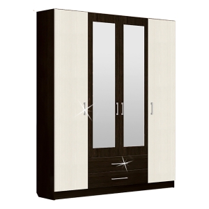 Большой и вместительный четырёхдверный шкаф модульной спальни Токио вместит в себя все, что необходимо. Для выполнения это непростой задачи он предоставит Вам два шкафчика с полками для белья - по четыре полки в каждом, вместительную платяную зону с штангой для одежды на вешалках и полкой, а также два больших зеркала, края которых имеют декоративную обработку "фацет" с двумя вместительными выдвижными ящиками под ними.