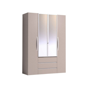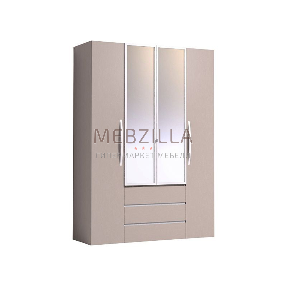 Вместительный шкаф для одежды и белья Brownie 555. Состоит: по бокам из двух одинаковых отделений по четыре полки в каждом за глухой дверцей и средней части, в которой сверху располагается штанга для вешалок за двумя глухими дверцами с зеркальными фасадами, а снизу три выдвижных ящика. Фасады шкафа украшают гнутые ручки из белой экокожи.