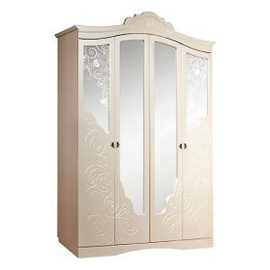 Шкаф для одежды Жемчужина КМК 0380.11 условно разделен на две части - в одной из них находится платяное отделение с двумя полками ЛДСП вверху и внизу, а в другом, бельевом отделении, размещены семь полок ЛДСП для хранения одежды. Фасад шкафа оформлен из МДФ с вставками из зеркал. И фасад шкафа и зеркала украшены рисунками, которые подчеркивают изысканный стиль мебели.