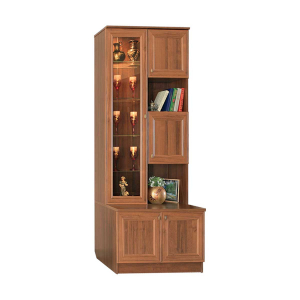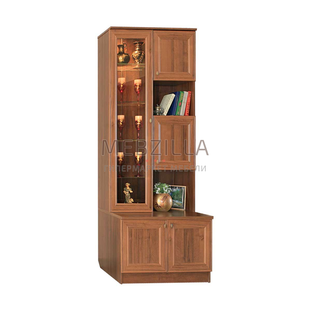 Шкаф комби №7 модульной гостиной Диана Люкс соединил в себе множество элементов - это и остекленная витрина с четырьмя полками и возможностью дополнительной установки подсветки на стеклополки, шкафчики, открытые полки, столешница толщиной 22 мм и шкафчик для хранения в нижней части с глухими дверцами.