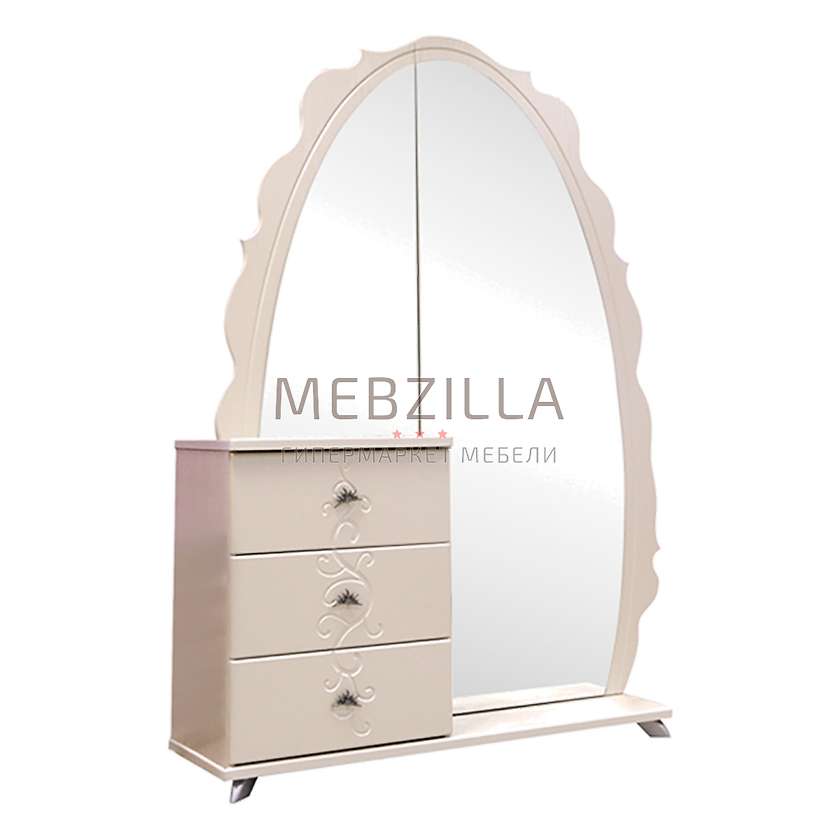 Необычный шкаф комбинированный Жемчужина с зеркалом КМК 0380.12 никого не оставит равнодушным - к комоду из трех выдвижных ящиков и двух больших зеркал добавляется неожиданный функционал - за одним из зеркал, которое является дверцей, скрываются полки и выдвижные ящики.