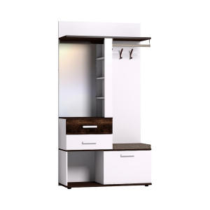 Шкаф многоцелевого назначения Норвуд состоит из двух выдвижных ящиков, открытой ниши и закрытой ниши с полочкой, трёх малых открытых полок справа от зеркала, широкой антресоли для головных уборов, трёх железных двойных крючков для одежды и штанги для вешалок.