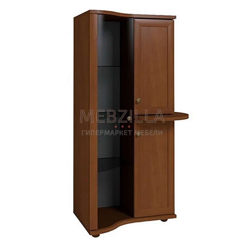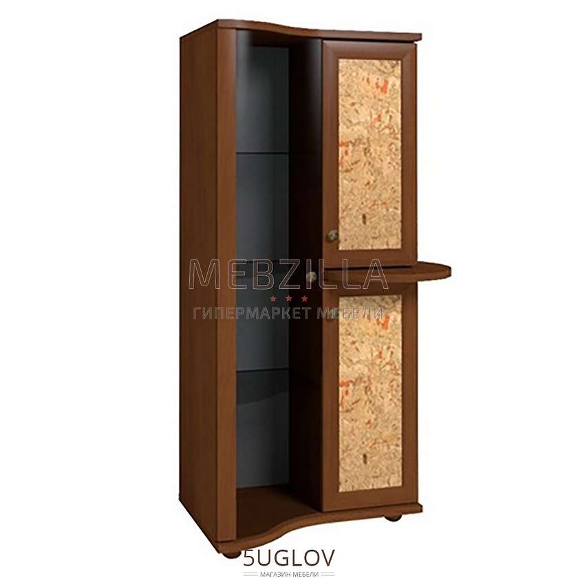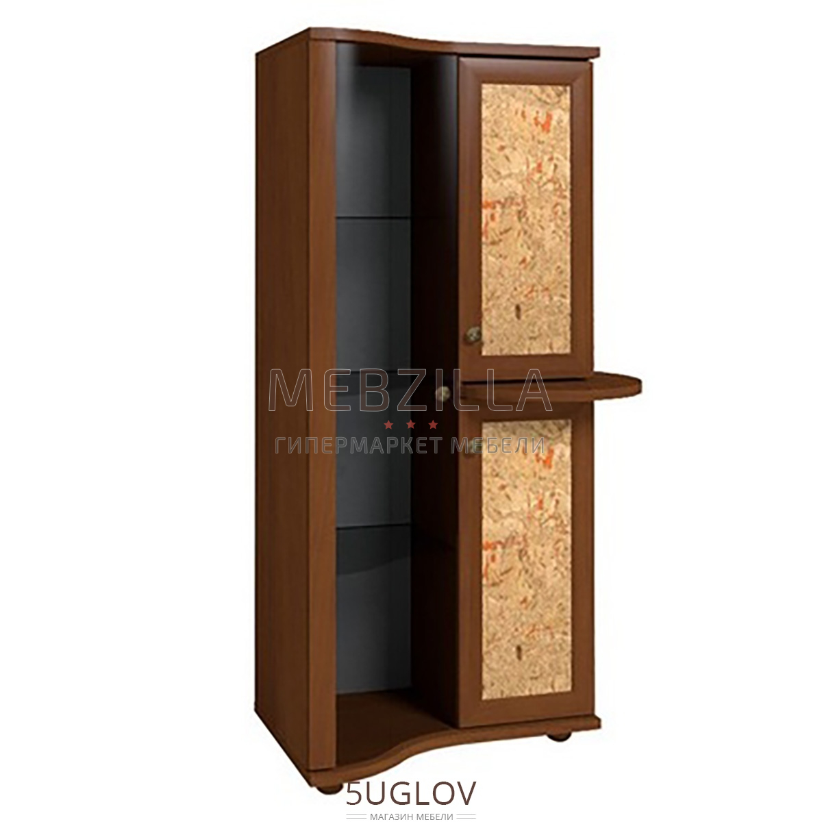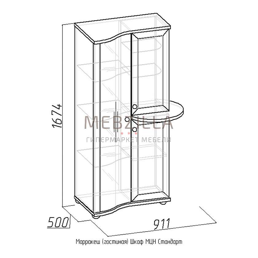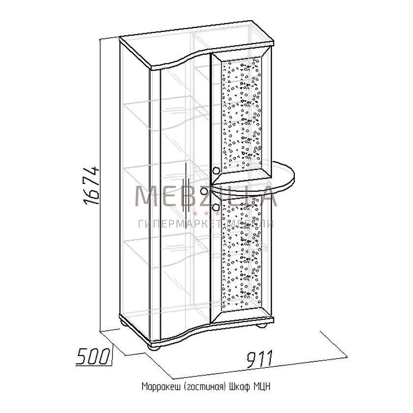 Шкаф МЦН Марракеш состоит слева из трёх стеклянных полок за гнутой стеклянной дверцей и справа разделён на две части с глухими дверками, в верхней две полки, в нижней одна полка, разделены они выступающей круглой полочкой. Дверные петли оснащены демпферами, что обеспечивает мягкое и бесшумное закрывание дверей. Регулируемые декоративные опоры-ножки позволят скорректировать недостатки любого неровного покрытия. Этот шкаф послужит прекрасной витриной вашим коллекциям, украсит и придаст оригинальности гостиной Марракеш.