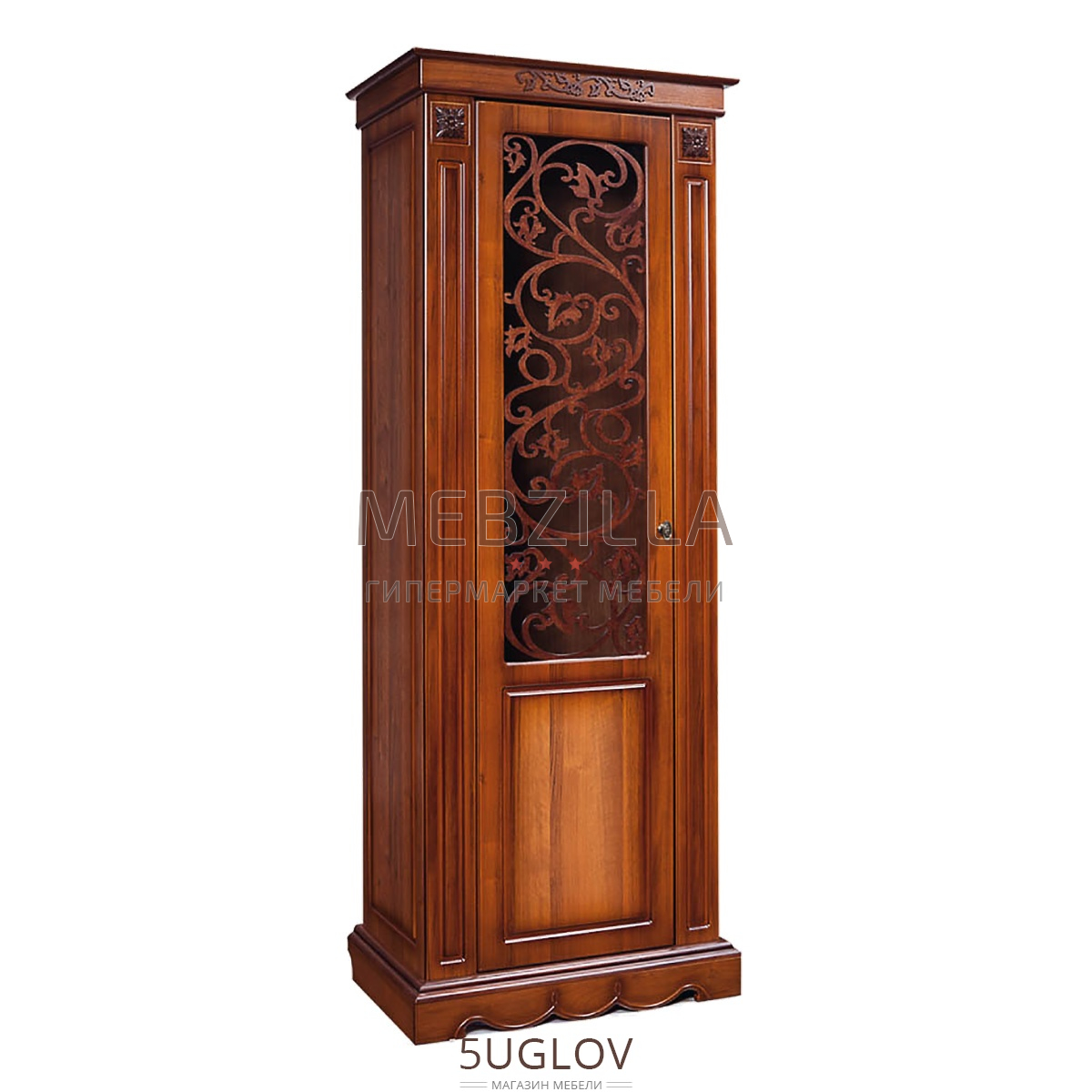 Классический однодверный шкаф со стеклянной витриной 1Д Амелия КМК 0435.11 - вместительный шкаф с тремя стеклянными полками и двумя полками ЛДСП. На стекле дверцы шкафа нанесен рисунок.