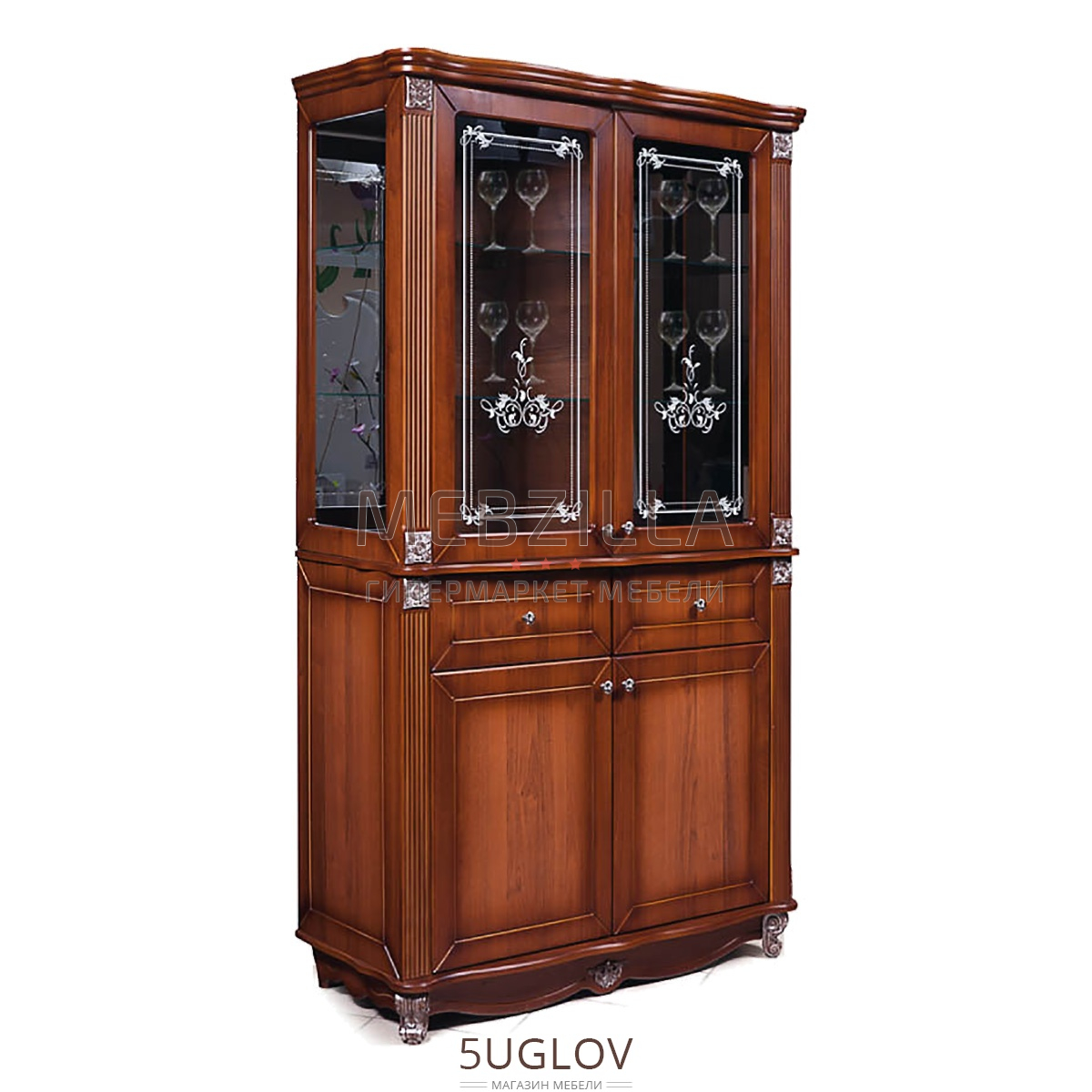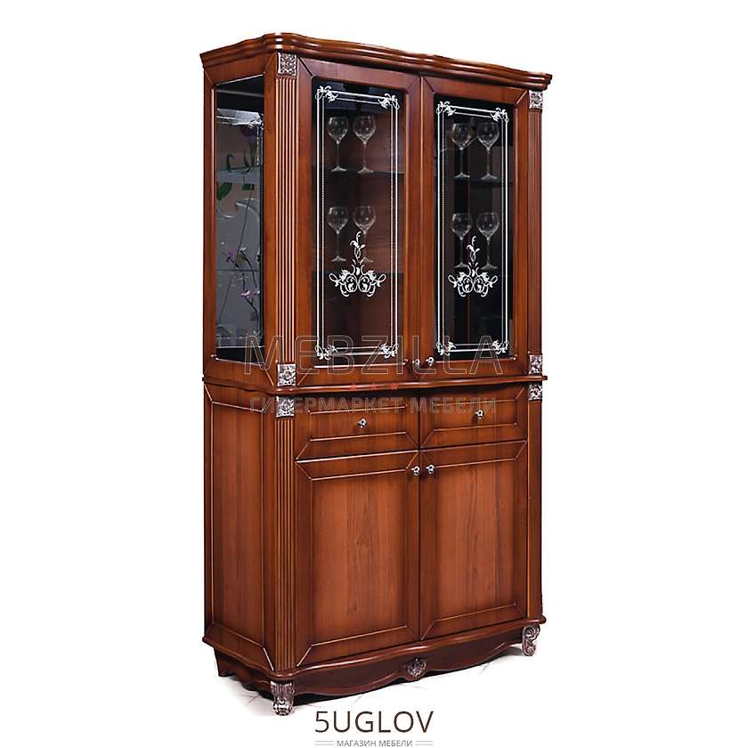 Шкаф с витриной Баккара 0441.4 - яркий представитель классического дизайна, наполненный функционалом. Шкаф включает в себя четыре стеклянные полки за остекленными дверцами витрин, два выдвижных ящика и две полки ЛДСП в нижней части шкафа, скрытые глухими дверцами шкафчиков. В качестве дополнительной опции на стекло дверец витрин можно нанести стильный рисунок.