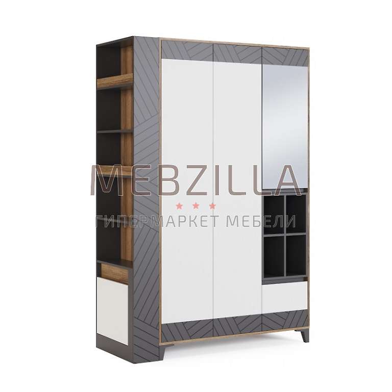 Универсальный шкаф со стеллажом из коллекции Гринвич – функциональный и необычно яркий дуэт. Геометрический принт на фасадах, отсутствие лицевой фурнитуры, сочетание открытых и закрытых зон - такой комплект пригодится в любом современном интерьере. В комплект также входят штанга и полки - внутреннее наполнение шкафа.