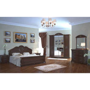 Спальня Да Винчи комплектация 01 выполнена в старинном дворцовом стиле, украшена орнаментом и декоративными элементами. Состоит из вместительного четырехдверного шкафа Да Винчи СД-01, комода Да Винчи СД-05, зеркала Да Винчи СД-06, двуспальной кровати Да Винчи СД-02 и двух прикроватных тумбочек Да Винчи СД-03. Шкаф Да Винчи состоит из трех отделений (два боковых с полками для вещей и одно большое со штангой для одежды и полкой для головных уборов), комод имеет четыре больших выдвижных ящика для хранения различных вещей. Спальня изготавливается в двух цветовых вариациях: орех и патина белая.