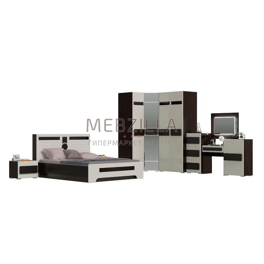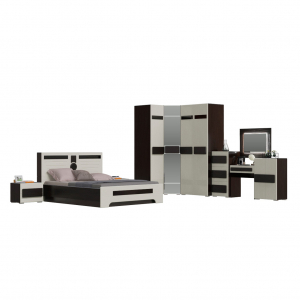 Спальня Престиж комплектация 01 выполнена в современном стиле. Состоит из набора шкафов Престиж СП-01, СП-02, СП-05, комода Престиж СП-09, туалетного столика Престиж СП-10, зеркала Престиж СП-12, тумбы туалетной Престиж СП-11, двуспальной кровати Престиж СП-06 и двух прикроватных тумбочек Престиж СП-08. Модули спальни имеют большое количество полок разных размеров и конфигураций, выдвижных ящиков. Двери углового шкафа оборудованы зеркалом на всю их высоту, остальные фасады украшены 3D-фрезеровкой и вставками из стекла лакобель.