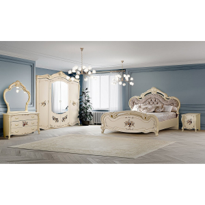 Стильная современная Спальня Альба создана в классическом стиле и имеет все необходимые элементы для комфортного отдыха: две компактные прикроватные тумбы, удобный комод с зеркалом и вместительный четырехдверный шкаф с двумя зеркалами. Центром этой спальни является роскошная двуспальная кровать с большим мягким изголовьем из ткани с каретной стяжкой, которое по форме напоминает корону. В дизайне присутствует много декора - резьба в виде лепнины, объемные накладки из пенополиуретана и МДФ, цветочный орнамент, имитирующий художественную роспись цветами. Цвет покрытия - слоновая кость (матовая). Спальный комплект создаст идеальное место для отдыха в вашем доме.