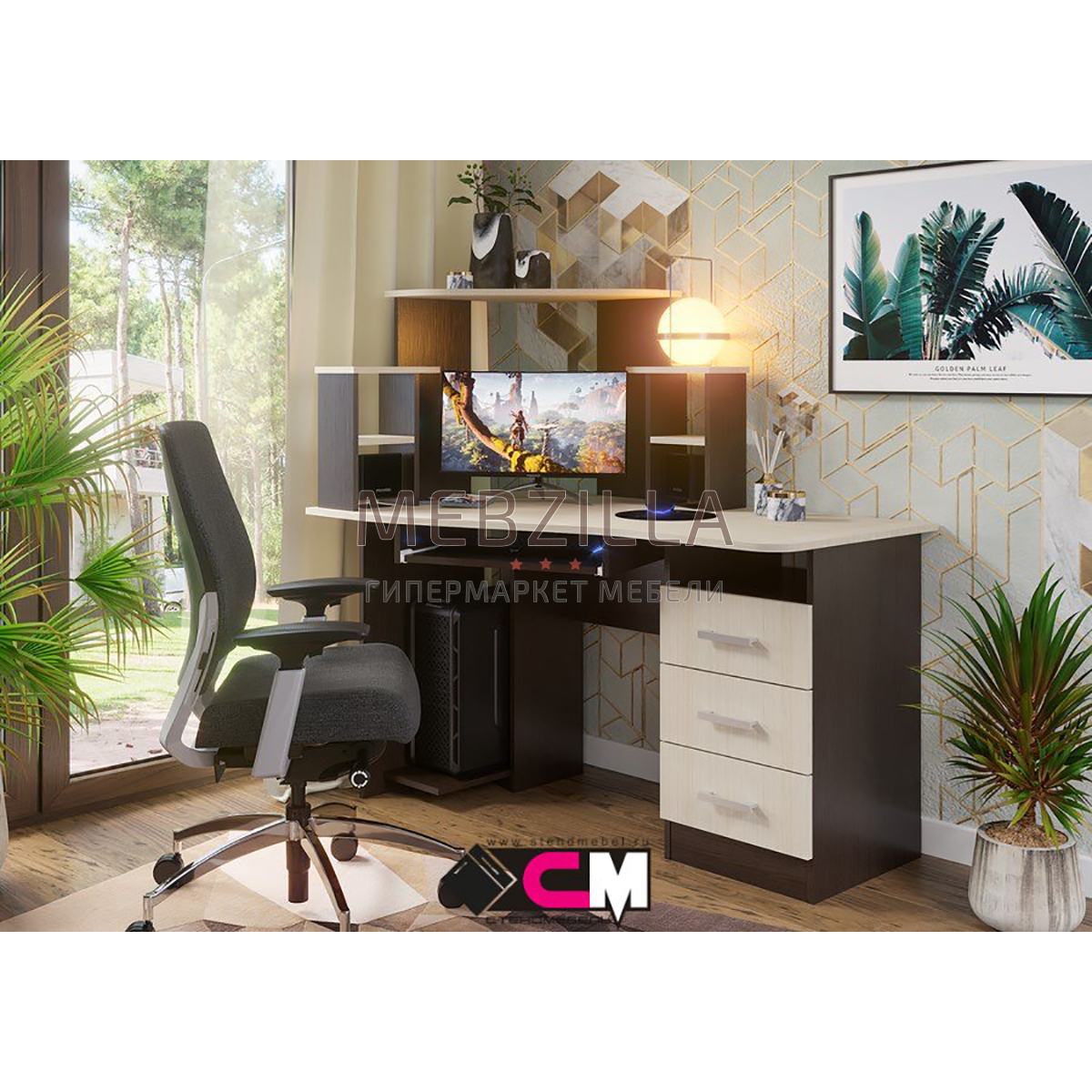 Компьютерный стол №1 отлично подойдет для комнаты школьника или рабочего кабинета. Стильный стол оснащен надстройкой, в виде полок для размещения книг, журналов, часов, а также тремя выдвижными ящиками для канцелярских принадлежностей, полкой под клавиатуру и системный блок. Современный дизайн гармонично впишется в любой интерьер.