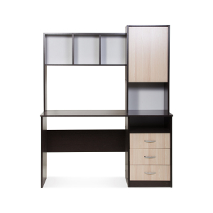Практичный и стильный компьютерный стол Бител СК-9 изготовлен в современном стиле. Модель включает в себя широкую столешницу для монитора, две закрытые полки, три выдвижных ящика и пять открытых ниш. Всё это соединено в единую функциональную композицию, которая, занимая относительно немного места, создаёт удобный рабочий уголок.