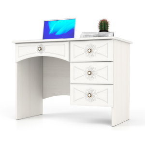 Функциональный письменный стол Онега МД-1-06 декорирован глубокой фрезеровкой и украшен рисунком, выполненным с применением технологии 3D. Стол состоит из рабочей поверхности - столешницы и четырёх вместительных выдвижных ящиков. Расположение тумбы с тремя ящиками - справа - неизменно. На столе легко поместятся монитор компьютера или ноутбук, а также материалы для учебы, а в выдвижных ящиках - документы, книги, учебники, тетради и много канцелярских принадлежностей. Письменный стол Онега МД-1-06 является одним из элементов набора мебели Онега.