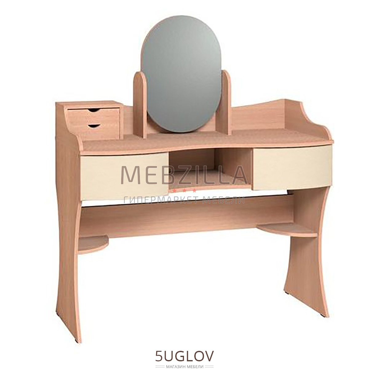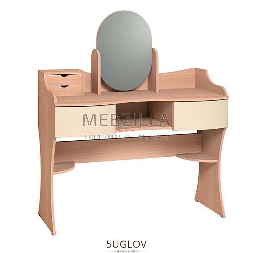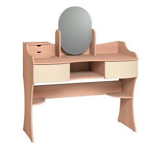 Туалетный стол АМЕЛИ состоит из двух выдвижных ящиков и открытой полки, расположенных под столешницей, двух малых выдвижных ящиков, расположенных на столешнице, двух открытых закруглённых полок, расположенной снизу, под выдвижными ящиками и вращающего зеркала. Этот стол будет гармонично смотреться в вашей спальне АМЕЛИ.