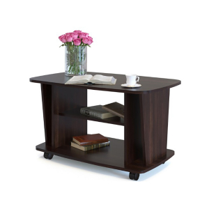 Стол журнальный СЖ-3 изготовлен в современном стиле, который прекрасно дополнит интерьер гостиной. Изделие оборудовано двумя полками для размещения необходимых вещей либо журналов. Так же имеются колесики для легкого передвижения стола.