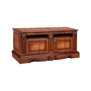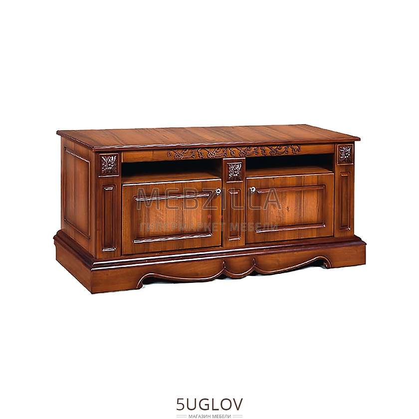 Классическая тумба под телевизор Амелия КМК 0435.12 включает в себя не только столешницу для установки телевизора но и два шкафчика, за дверцами которых скрыты две полки ЛДСП.