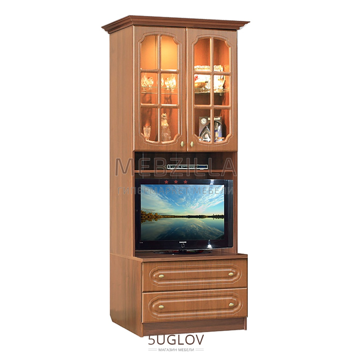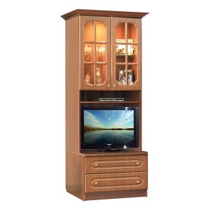 Классическая витрина №1 из состава модульной гостиной Диана МДФ включает в себя верхнюю витрину с остеклением дверец, за которыми расположились две полки. В остекленной витрине дополнительно можно установить подсветку стеклополок. Ниже располагается открытая полка и ниша для телевизора размерами 588х818 мм. В самом низу витрины находятся для выкатных ящика для хранения вещей. Толстая столешница 22 мм позволит не беспокоиться о прочности конструкции.